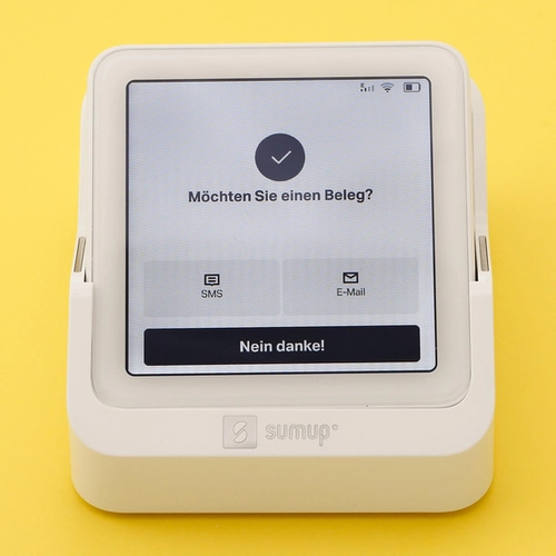 Das neuste Modell heißt SumUp Solo und ist in vielerlei Hinsicht besonders: Es ist klein, quadratisch und vollumfänglich. Die PIN tippen Kunden über einen Touchscreen ein. Eine passende Docking-Station mit Bondrucker ist außerdem verfügbar.